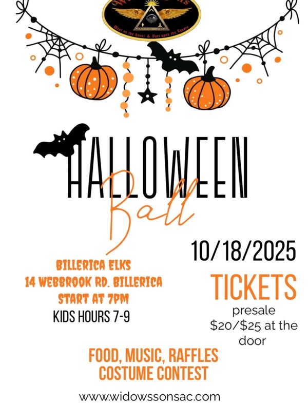 Join Ancient Craft Widows Sons Branded MRA for our Annual Halloween Ball! All Proceeds Benefit the Local Chapter of the American Foundation for Suicide Prevention! Doors Open at 7PM with the Kids getting a Chance to Party until 9PM! The Real Fun Begins at 9pm and Goes until Midnight! Enjoy Great Food while listening/dancing to Spooktacular Classics! There will be Raffles and Prizes, Games, and More! The Best Part of All is that it's only $25 at the door and 100% of the Money Raised Goes Directly to the American Foundation for Suicide Prevention!